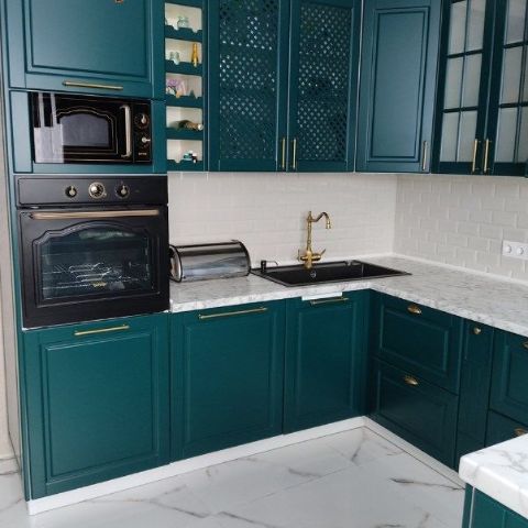 Ещё одна великолепная кухня уже готова к использованию и приносит радость своей хозяйке. Фасады выполнены из крашеного матового МДФ.